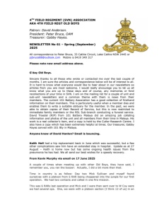 4 TH FIELD REGIMENT (SVN) ASSOCIATION AKA 4TH FIELD REGT OLD BOYS Patron: David Anderson. President: Peter Bruce, OAM Treasurer: Gabby Hayes. NEWSLETTER No 61 – Spring (September) 2025 All correspondence to Peter Bruce, 33 Cathie Circuit, Lake Cathie NSW 2445 or pjbruce88@outlook.com Mobile is 0419 349 317 Please note new email address above. G’day Old Boys. Sincere thanks to all those who wrote or contacted me over the last couple of months. I am sure the articles and correspondence below will be of interest to all. It is hard to know what everyone would like to hear about in our newsletters so articles from you are most welcome. I would really encourage you to let us all know what you are up to these days and of course, any memories or fond recollections of your time in SVN. I am on the mailing list for a couple of unit and sub-unit newsletters and a common theme with them is news from their members. The current 101 Battery Association has a good collection of firsthand information on their members. This is particularly useful when a member dies and enables them to write a suitable obituary for the member. In the past, we were able to obtain copies of their Record of Service, but this is now restricted to immediate family members or the RSL Sub-branch conducting a funeral service. David Troedel (RIP) from 101 Battery Malaya did an amazing job collating information and photos of the unit and all members from their time in Malaya. His work is a real collector’s item, and a copy is held by the Cutler Research Centre. I also have a copy which has been extremely helpful at times. Our treasurer, Gabby Hayes served with 101 Bty in Malaya. Anyone know of David Hanlon? Email is bouncing. Keith Hall had a hip replacement back in June which was successful, but a few other complications saw him have an extended stay in hospital. Update as at 27 August – Keith is home now but has some ongoing health issues from the pneumonia he has had. We all send our best wishes for a speedy recovery. From Kevin Murphy via email on 17 June 2025 A couple of times when meeting up with other Old Boys, they have said, I remember you, you ran the boozer: Actually, I did a bit more than that: Time in country is as follow: Day two Mick Sullivan and myself found ourselves with a platoon from 6 RAR being choppered into the jungle for our first operation. We had two contacts and called in one fire mission. This was 6 RARs last operation and Mick and I were then sent over to W Coy were we had several ops. One, we were with a platoon section (I think 12 of us) in an