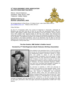 4TH FIELD REGIMENT (SVN) ASSOCIATION AKA 4TH FIELD REGT OLD BOYS Patron: David Anderson. President: Peter Bruce, OAM Treasurer: Gabby Hayes. NEWSLETTER No 62 Summer (December) 2025 All correspondence to Peter Bruce, 33 Cathie Circuit, Lake Cathie NSW 2445 or pjbruce88@outlook.com Mobile is 0419 349 317 G’day Old Boys On the 5th of December 2025, the current 4th Regiment in Townsville, celebrated St Barbara’s day and their final day of work for the year. Our sponsored award, The Don Donkin, MBE Soldier’s Soldier Award was awarded to the first recipient, Gunner Joshua Hurd. More details later. Special thanks to Old Boy John Wilson who financed the engraving, donated a copy of the Don Donkin story, and presented the award on behalf of all our Old Boys. The Regiment has been very receptive and accommodating for our award and perhaps in the future sometime, more of us ‘Old Boys’ may be able to visit the Regiment and witness first hand, future award presentations and get a special look at what the Regiment is doing these days. The Don Donkin, MBE Soldier’s Soldier Award Donated by 4th Field Regiment (South Vietnam) Old Boys Association Don enlisted in the Australian Army in 1947 as soon as he turned 18. His first posting was to the Guard Platoon at Headquarters Eastern Command, Sydney. In 1948, Don was posted to Japan to join the British Commonwealth Occupation Force and joined ‘A’ Field Battery as a driver. Don returned to Australia in 1949 with ‘A’ Battery to North Head in Sydney. In 1953 Don transferred to Infantry to secure a posting to Korea with 3rd Battalion, the Royal Australian Regiment (3RAR). Don went from Command Post Sergeant ‘A’ Battery to a platoon sergeant with Delta Company, 3RAR. He returned to Australia in 1954 and returned to Artillery with a posting as Troop Sergeant ‘Baker’ Troop in ‘A’ Field Battery at Georges Heights. The following year, Don moved to Holsworthy with promotion to Warrant Officer Class Two and became the first Battery Sergeant Major of the newly formed 102nd Field Battery, as part of 1st Field Regiment. In the late 1950s, following a reduction in the size of the Army, Don reverted to Sergeant and was posted as an instructor at the School of Artillery. By 1960 he was again promoted to WO2 and again assumed the appointment of BSM 102nd Field Battery.